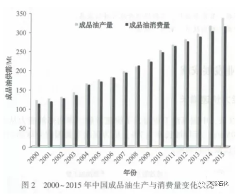 2015年,中国炼厂原油加工量为522Mt,生产成品油38Mt,其中汽油121.04Mt,煤油36.59Mt、柴油180.08Mt;成品油消费量为315Mt.其中汽油114.33Mt、煤油27.44Mt、柴油173.05M。2015年成品油出口25.44Mt.进口4.08Mt.