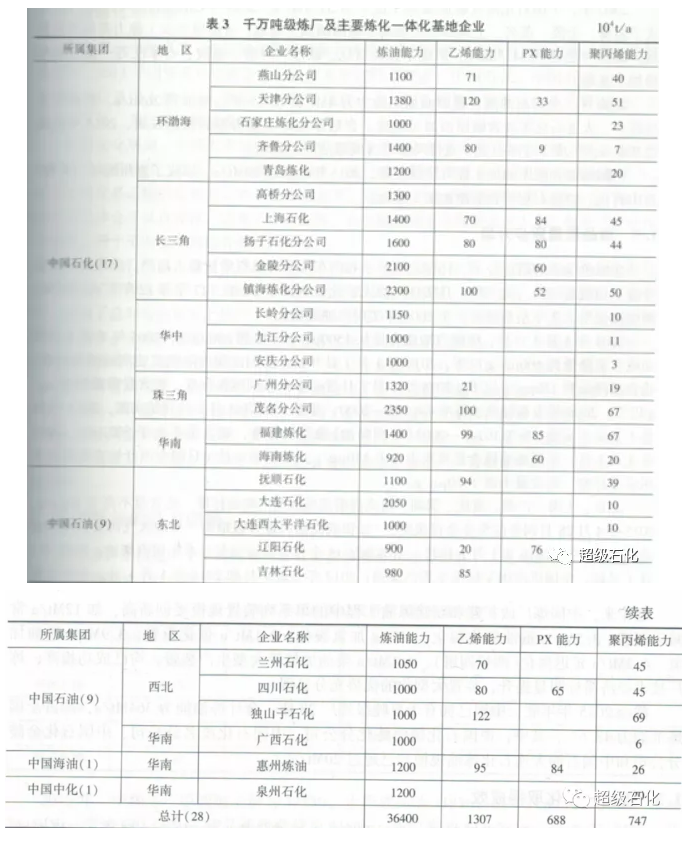 官芳则芳”的炼油理念,使宝贵的石油资源得到合理优化利用同时,集中综合利用炼厂和石化装置的各种产品和中间产物,方便原料和产品的集中进出,提升设施共享水平,减少水、电、汽、热、风等公用工程系统的投资和费用,提高经济效益。中国炼油工业依托万吨级大型炼厂的建设,结合大型乙烯工程的新建或改扩建,已经形成了一批大型炼化一体化基地企业,明显提升炼油业务的竞争力、如表3所示。