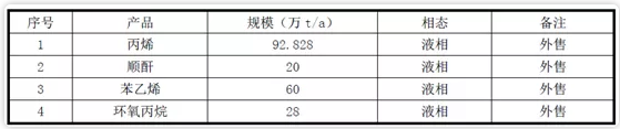 项目外售主要产品为聚合级丙烯、顺酐、苯乙烯、环氧丙烷,外售副产品为碳四轻烃、轻芳烃、干气、燃料油等。