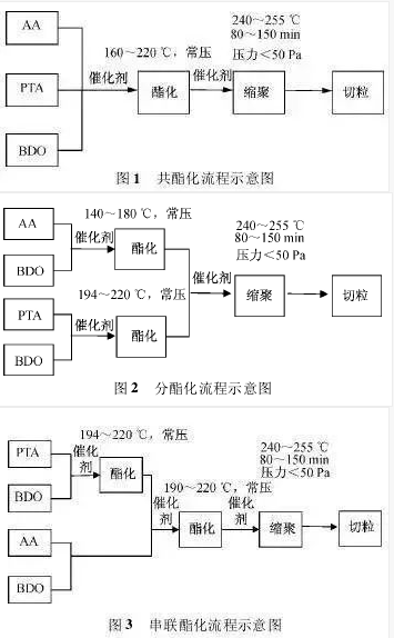 PBAT的制备有三种酯化方式:共酯化、分酯化和串联酯化。制备流程图及主要工艺参数如下图1、图2、图3所示。以己二酸(AA)、对苯二甲酸(PTA)、丁二醇(BDO)为单体,按照一定比例合成聚己二酸/对苯二甲酸丁二醇酯,工艺过程中重点在于严格控制反应的酯化方式、酯化时间、缩聚温度、稳定剂等。这些关键因素能够直接影响合成过程,最终影响产品的性能。为确保制备出良好的PBAT树脂,所需的最佳工艺条件为:共酯化反应方式,酯化时间为185 min,缩聚温度248~250 ℃,稳定剂添加量70 μg/g。PBAT的制备有三种酯化方式,包括:共酯化、分酯化和串联酯化。